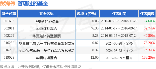 彭海伟先生:中国科学院管理科学与工程学硕士。2004年9月加入原中信基金,曾任研究员,华夏基金研究员、基金经理助理。华夏红利混合型证券投资基金基金经理(2014年1月17日至2016年9月14日)、华夏平稳增长混合型证券投资基金基金经理(2015年2月9日起任职)、华夏新经济灵活配置混合型发起式证券投资基金基金经理(2015年7月13日至2018年11月28日)、华夏经济转型股票型证券投资基金基金经理(2016年3月15日至2018年7月24日)。华夏景气成长一年持有期混合型发起式证券投资基金基金经理(2024年3月28日起任职)。