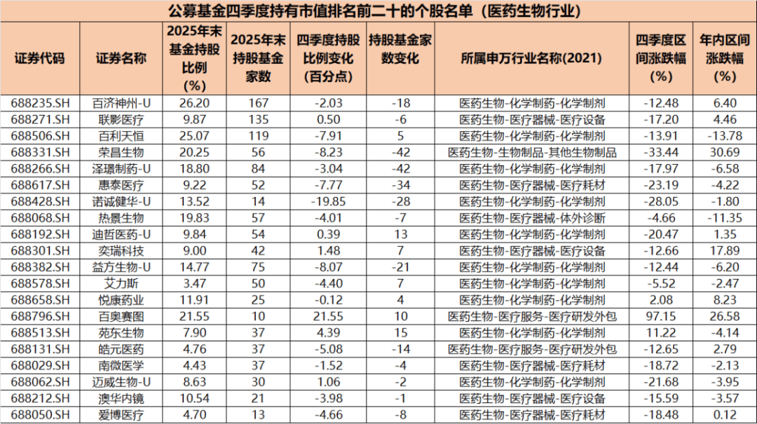 从公募基金四季度对科创板的调仓来看,医药生物板块仍是其结构性加仓的重要方向。在持股比例(流通股)增持幅度排名前二十的公司中,该板块强势占据六席。