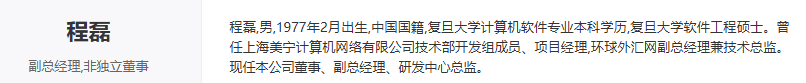 东方财富官网最新资料显示,程磊,现年49岁,1977年2月生,复旦大学计算机软件专业本科学历,复旦大学软件工程硕士。现任公司董事、副总经理、研发中心总监。曾任上海美宁计算机网络有限公司技术部开发组成员、项目经理,环球外汇网副总经理兼技术总监。程磊当年的薪酬为291.72万元,相对上年增加29.88万元。