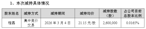 公告进一步指出,本次减持过后,程磊合计持股比例为0.1062%,其中无限售条件股份0.0142%,有限售条件股份0.0920%。