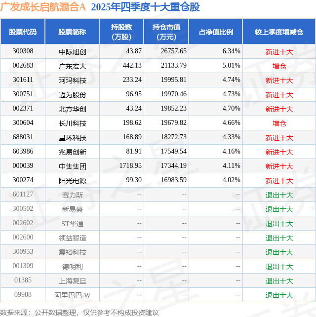 根据2025基金年报公募基金重仓股数据,重仓该股的公募基金共22家,其中持有数量最多的公募基金为广发基金的广发成长启航混合A。广发成长启航混合A目前规模为18.67亿元,最新净值2.8516(3月16日),较上一交易日上涨0.54%,近一年上涨64.54%。该公募基金现任基金经理为陈韫中。陈韫中在任的基金产品包括:广发中小盘精选混合A,管理时间为2021年9月28日至今,期间收益率为64.92%;广发科技动力股票,管理时间为2024年5月31日至今,期间收益率为75.17%;广发小盘成长混合(LOF)A,管理时间为2025年3月25日至今,期间收益率为48.08%。