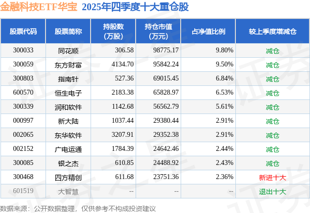 根据2025基金年报公募基金重仓股数据,重仓该股的公募基金共15家,其中持有数量最多的公募基金为华宝基金的金融科技ETF华宝。金融科技ETF华宝目前规模为100.84亿元,最新净值0.7121(4月9日),较上一交易日下跌3.01%,近一年上涨8.97%。该公募基金现任基金经理为陈建华 曹旭辰。陈建华在任的基金产品包括:华宝中证A100ETF联接A,管理时间为2012年12月22日至今,期间收益率为176.37%;化工ETF华宝,管理时间为2021年2月26日至今,期间收益率为-4.5%;有色ETF华宝,管理时间为2021年3月12日至今,期间收益率为118.46%。曹旭辰在任的基金产品包括:通用航空ETF华宝,管理时间为2025年5月22日至今,期间收益率为20.12%;创业板人工智能ETF华宝,管理时间为2025年5月22日至今,期间收益率为148.85%;港股互联网ETF华宝,管理时间为2025年5月22日至今,期间收益率为-16.59%;电子ETF华宝,管理时间为2025年5月22日至今,期间收益率为54.9%。