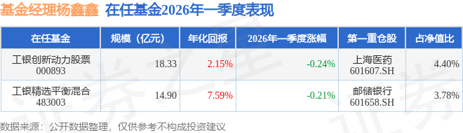 2026-04-23爱体育,爱体育官方网站,爱体育APP下载证券之星消息,截止2026年一季度末,基金经理杨鑫鑫旗下共管理2只基金,本季度表现最佳的为工银精选平衡混合(483003),季度净值跌0.21%。