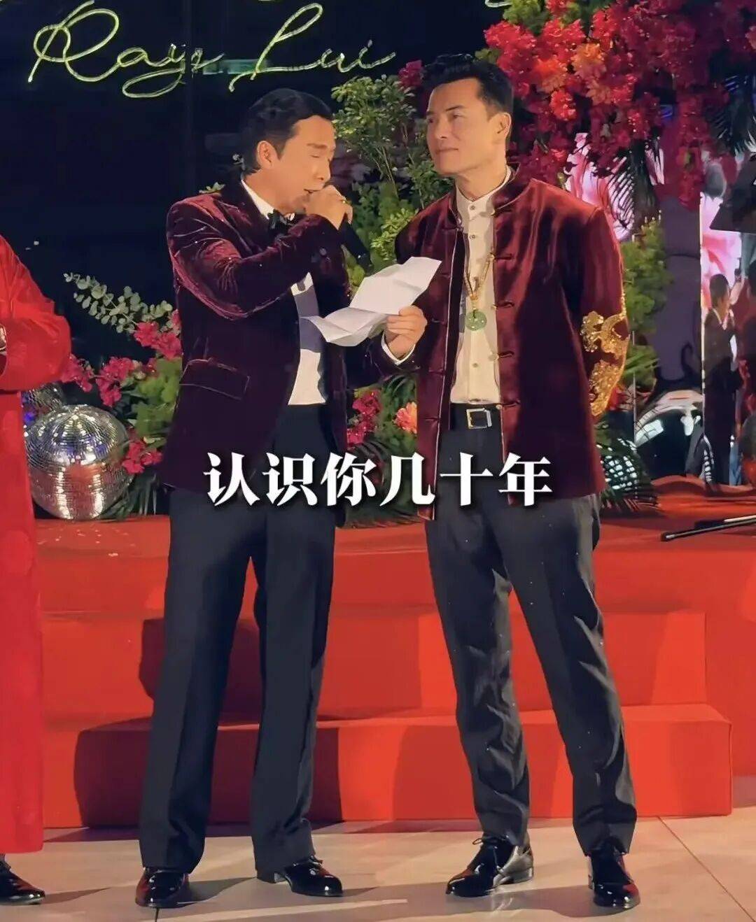 ▲甄子丹作为密友发表致辞。吕良伟表情:我倒要听听你能说出些什么?甄子丹和吕良伟有一个共同点,就是动作明星的他们都娶了比他们小的白富美女士。