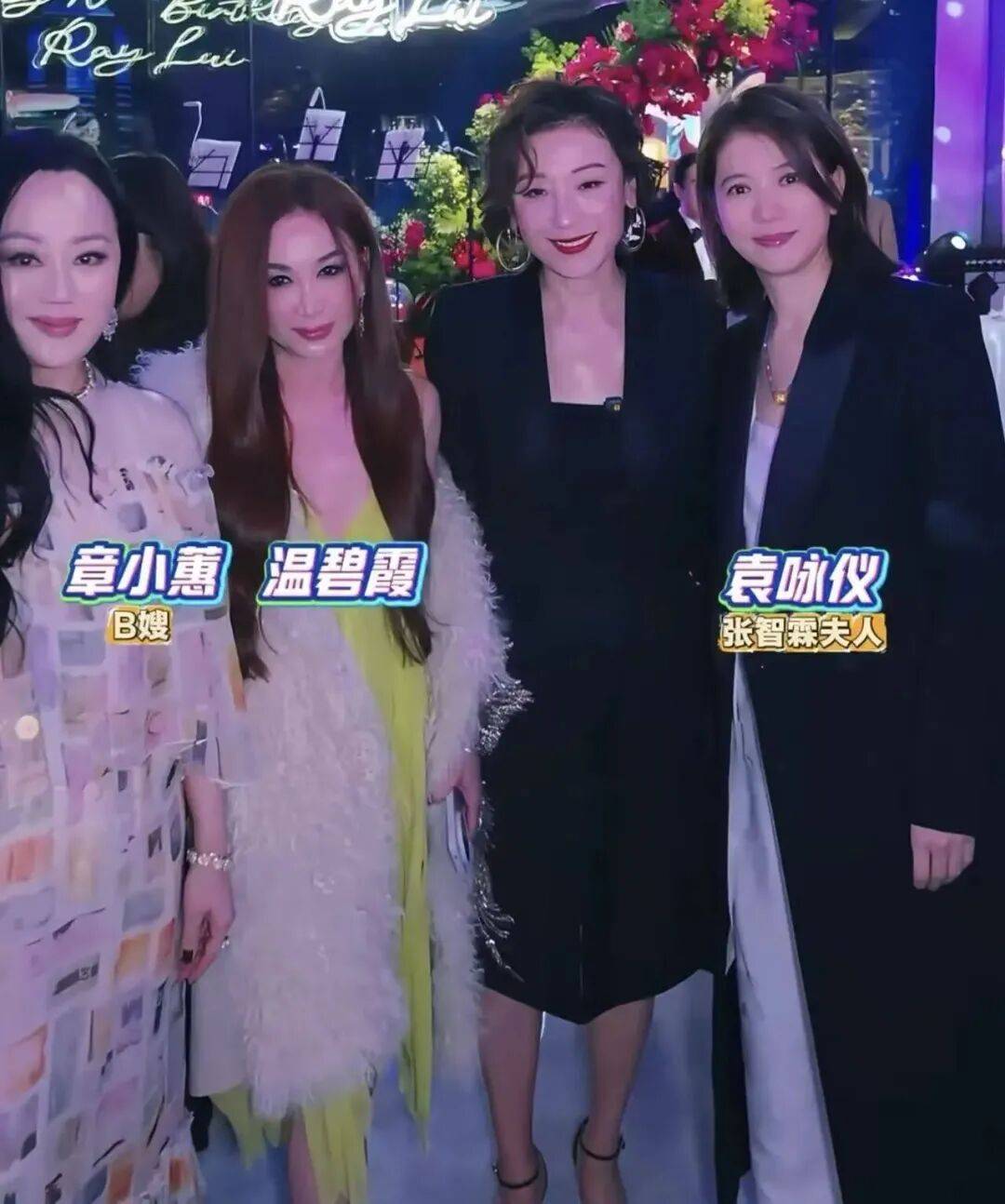 与袁咏仪合影的人中,我们还看到了温碧霞和章小蕙。温碧霞也参加过杨受成红宝石婚晚宴。章小蕙如今主要在内地发展,号称小红书一姐,且长居上海,不常回香港参加派对,但为什么要来俾面参加晚宴呢,因为她是吕良伟太太杨小娟的老友。
