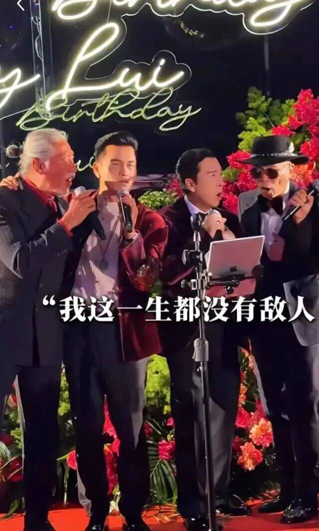 首先是他的密友甄子丹,寿宴上甄子丹就座吕良伟旁边。甄子丹曾经给吕良伟自传写序,说两人投缘到像从小就认识,但其实是因戏结缘。