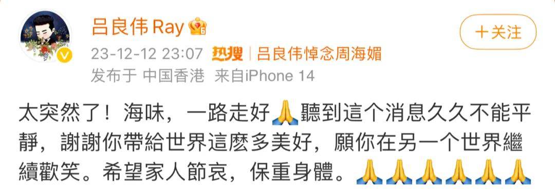 2023年周海媚去世时最先发声的也是他,吕良伟说“谢谢你带给世界这么多美好”。