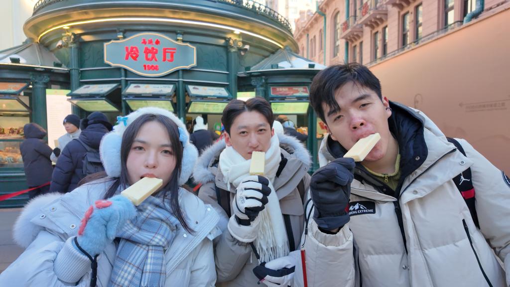 隆冬时节,哈尔滨中央大街上,人头攒动。尽管冷得跺脚,但游客们依旧入乡随俗,要来尝一尝马迭尔冰棍。