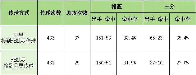 以下是本赛季班凯罗所有助攻给贝恩的回合(视频放在一楼)