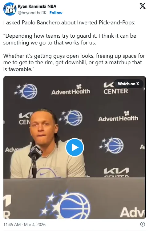 奥兰多已经偶尔在比赛中使用这种战术:让班凯罗持球发起,由后卫掩护后外弹到三分线外,但球队或许可以进一步提高这种战术的使用频率。