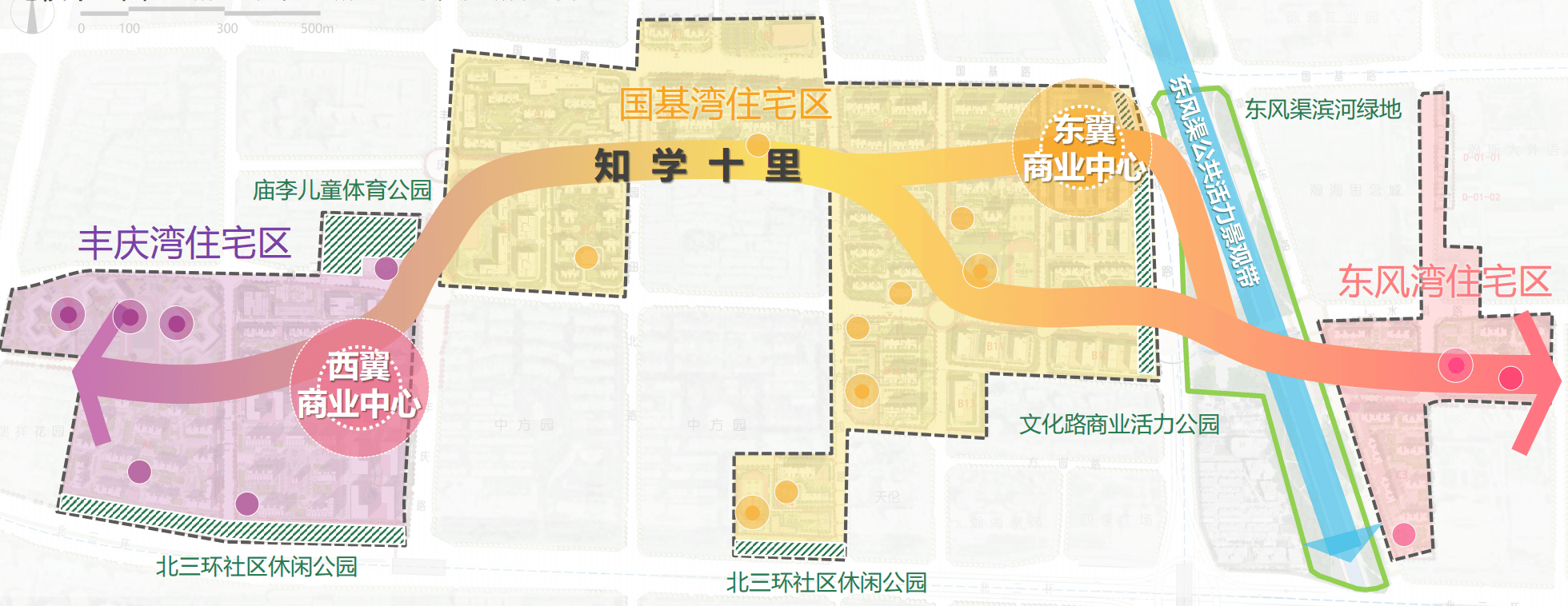 四公园:东风渠滨河绿地、北三环社区休闲公园、文化路商业活力公园、庙李儿童体育公园